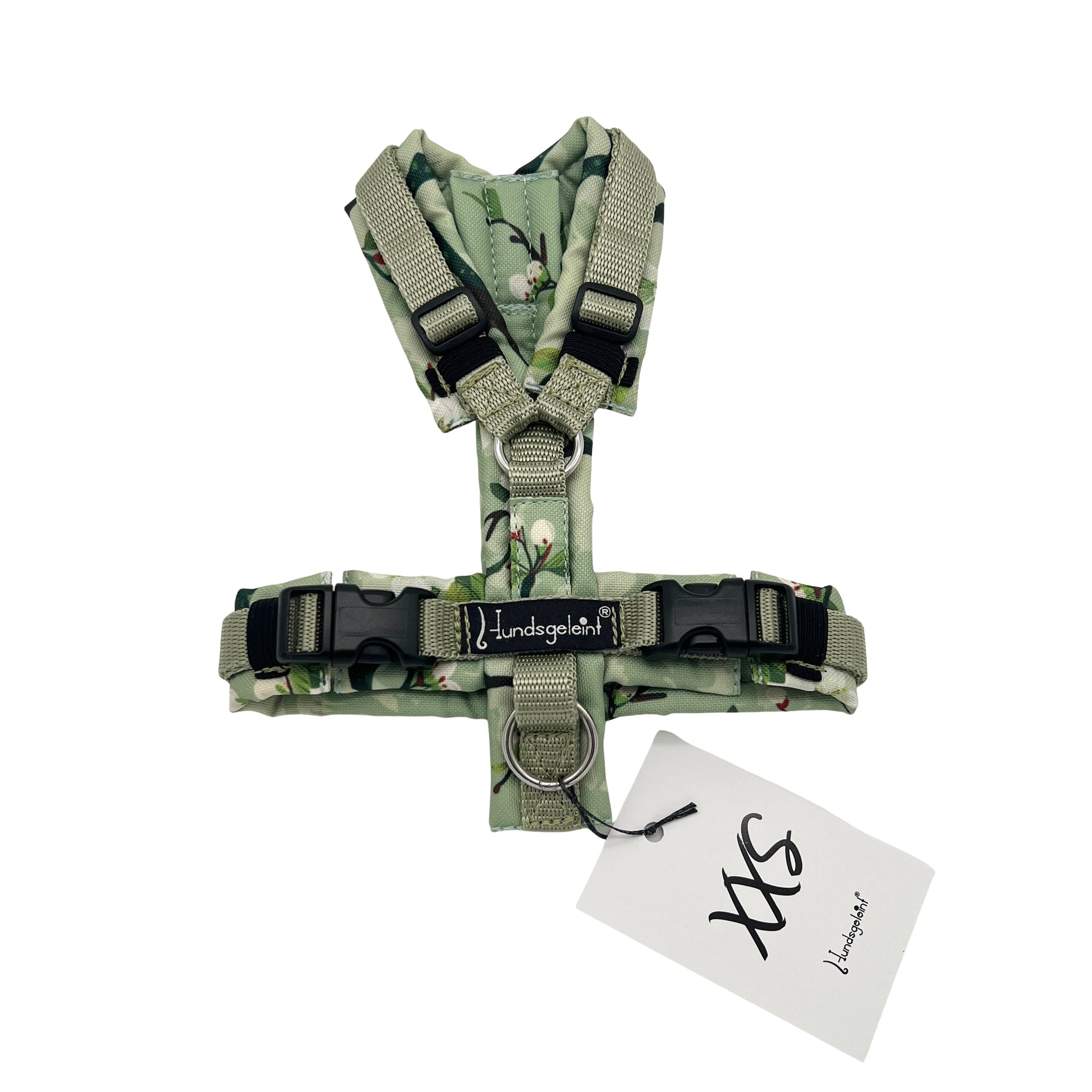 Die Geschirre werden mit stabilem Gurtband, Edelstahlringen (wahlweise Messingringen) und bruchsicheren Steckschnallen hergestellt. Das Polster aus hochwertigem Outdoorstoff ist robust, wasserabweisend und sorgt durch die innenliegende Füllung für zusätzlichen Tragekomfort.