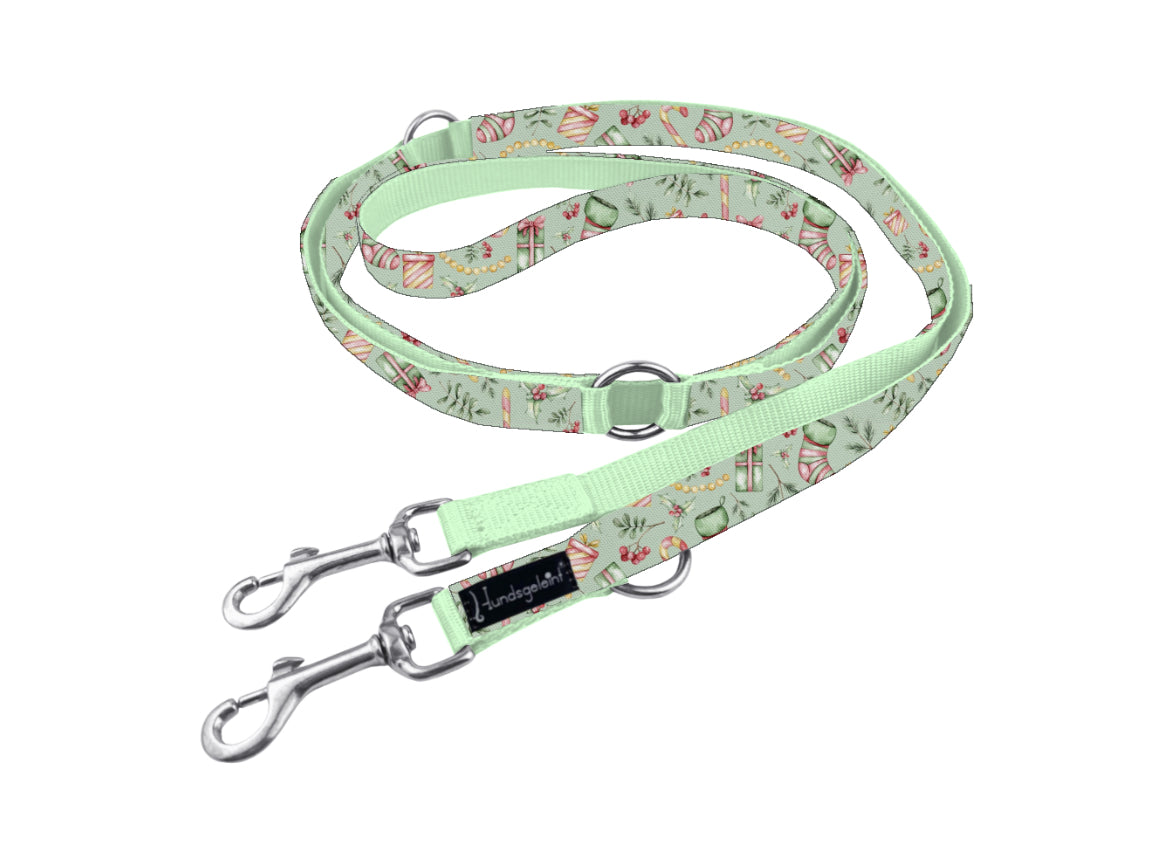 Die Leinen werden mit stabilem Gurtband, Edelstahlringen (wahlweise Messingringen) und mit Bolzenkarabiner hergestellt. Die Gurtband-Leine zeigt auf der einen Seite nur das Gurtband und auf der anderen nur den ausgewählten Stoff.