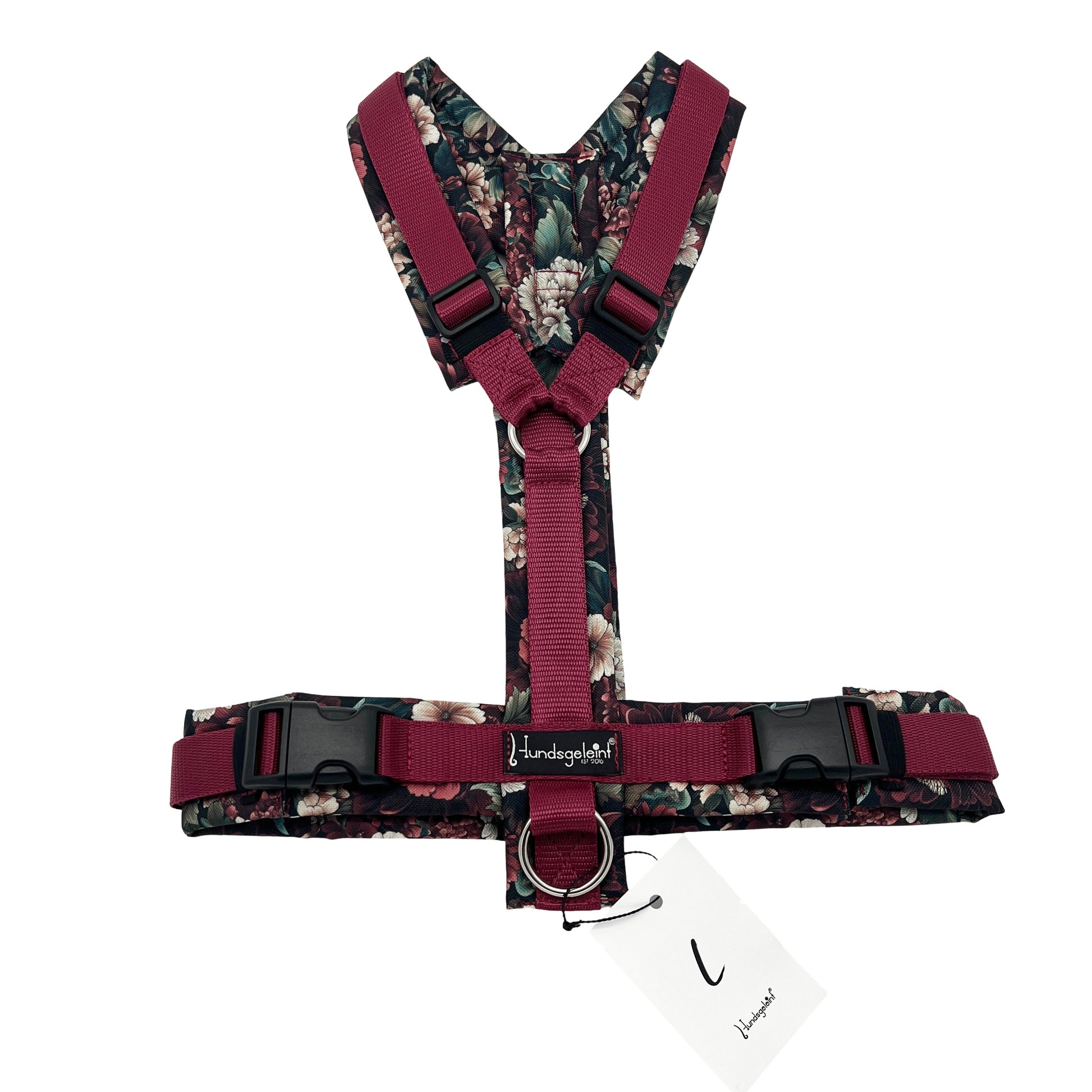 Die Geschirre werden mit stabilem Gurtband, Edelstahlringen (wahlweise Messingringen) und bruchsicheren Steckschnallen hergestellt. Das Polster aus hochwertigem Outdoorstoff ist robust, wasserabweisend und sorgt durch die innenliegende Füllung für zusätzlichen Tragekomfort.