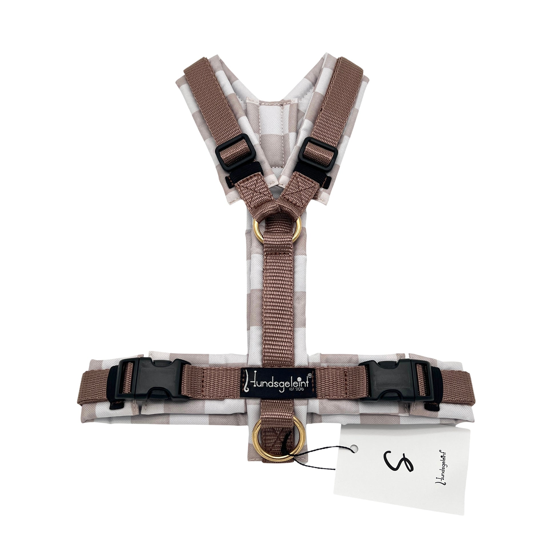 Die Geschirre werden mit stabilem Gurtband, Edelstahlringen (wahlweise Messingringen) und bruchsicheren Steckschnallen hergestellt. Das Polster aus hochwertigem Outdoorstoff ist robust, wasserabweisend und sorgt durch die innenliegende Füllung für zusätzlichen Tragekomfort.