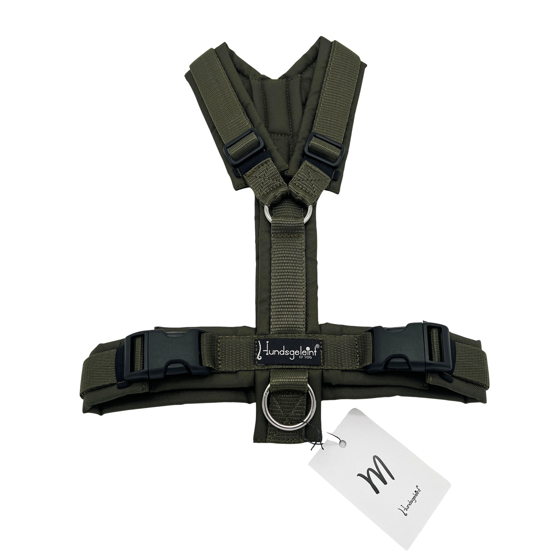 Die Geschirre werden mit stabilem Gurtband, Edelstahlringen (wahlweise Messingringen) und bruchsicheren Steckschnallen hergestellt. Das Polster aus hochwertigem Outdoorstoff ist robust, wasserabweisend und sorgt durch die innenliegende Füllung für zusätzlichen Tragekomfort.